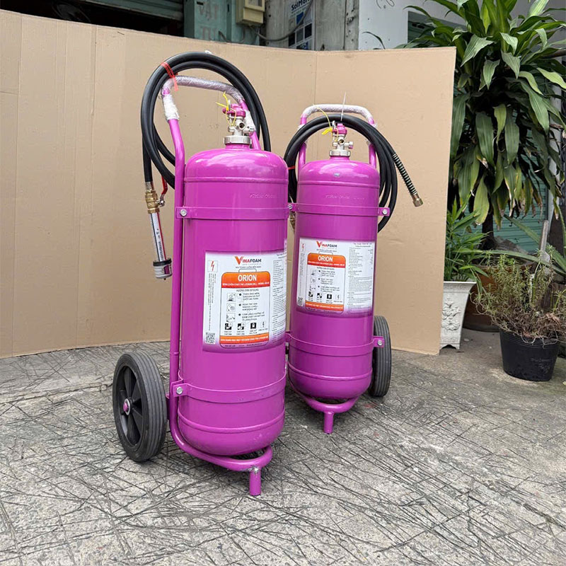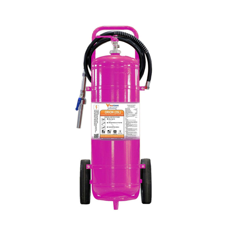 Bình chữa cháy ORION 25L xe đẩy là thiết bị chữa cháy dung tích lớn, chuyên dụng cho các đám cháy nguy hiểm từ pin Lithium-ion, cháy điện và các đám cháy loại A, B, C, F. Với thiết kế có bánh xe và tay đẩy, bình 25L dễ dàng di chuyển, phù hợp cho môi trường công nghiệp, kho bãi, trạm sạc xe điện, nhà máy sản xuất.